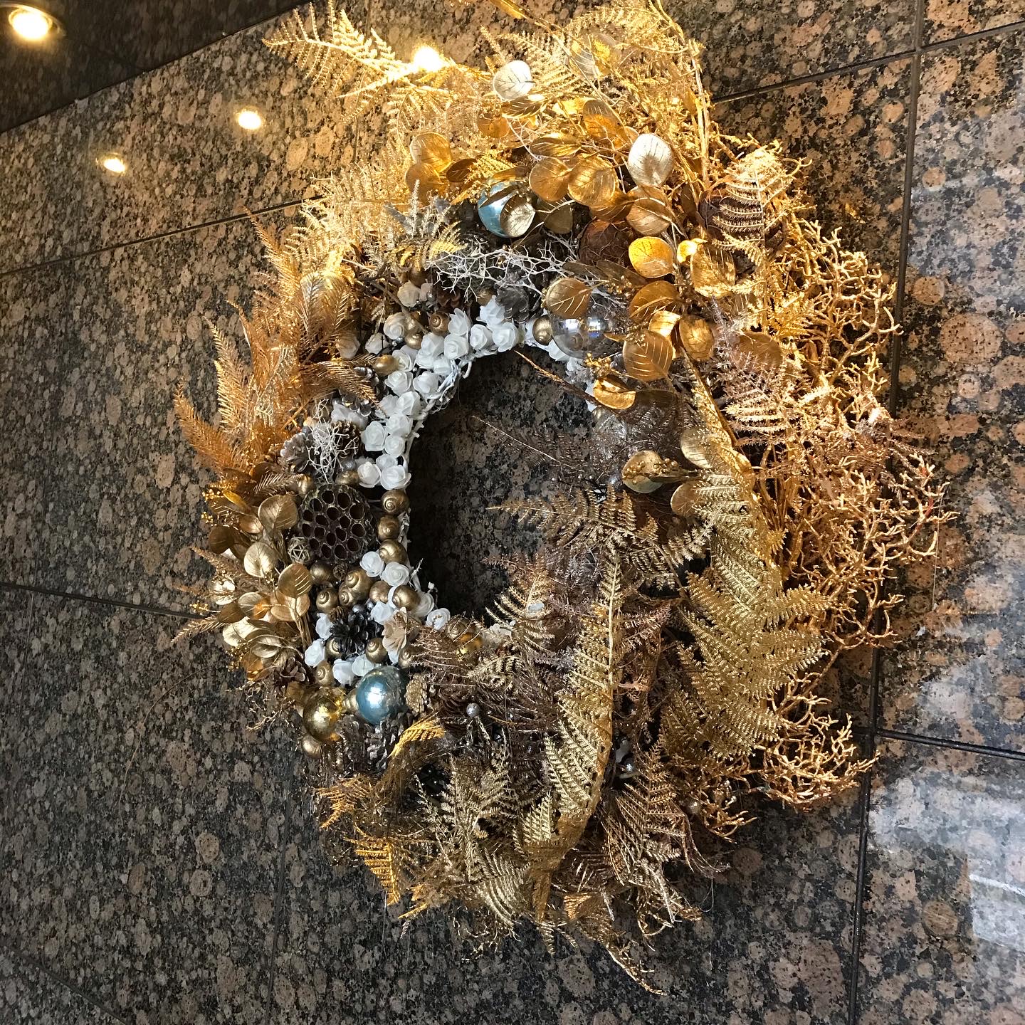 当ホテルのエントランスに、ゴールドで華やかなクリスマスリースが飾られております✨